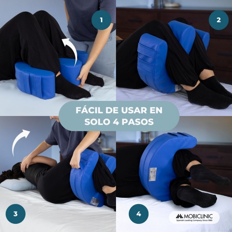 El uso del cojín Folk es intuitivo: basta con pasar las piernas del paciente por los huecos del cojín, colocar una mano en su cintura o espalda, y con la otra sujetar una de las asas laterales para proceder a girarlo con facilidad. Esta operación se puede realizar en casa, en centros asistenciales o durante viajes, gracias a su peso ligero y tamaño compacto.