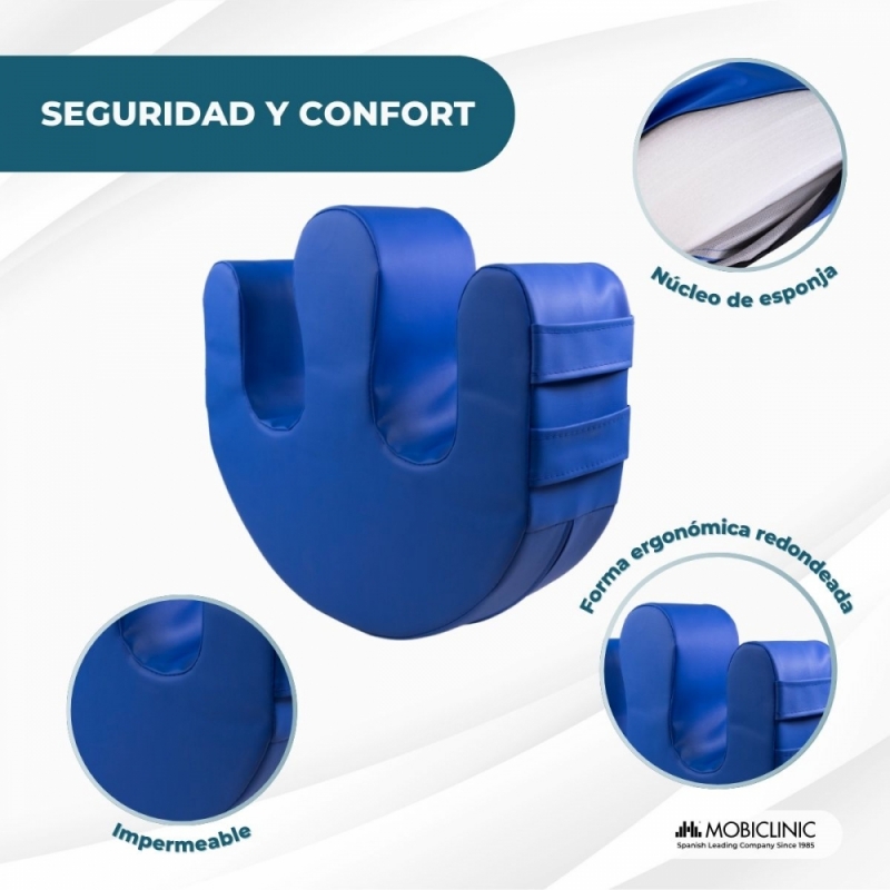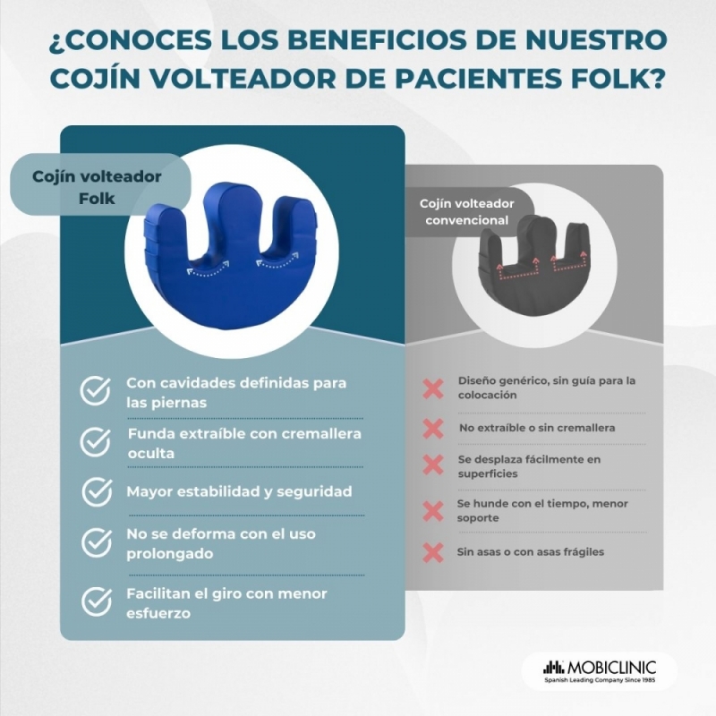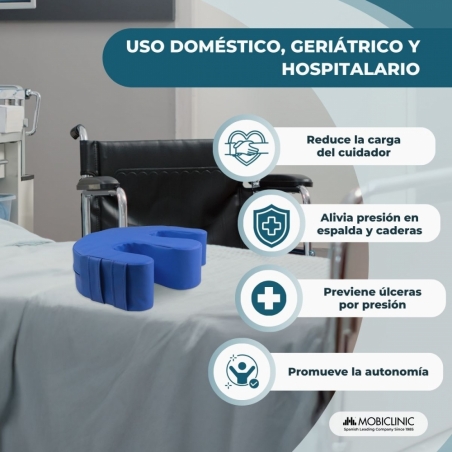 El cojín volteador Folk de Mobiclinic® ha sido diseñado para mejorar la asistencia a personas encamadas, facilitando los cambios posturales con total comodidad y seguridad. Su forma en U con separador redondeado para las piernas y sus dos asas laterales ergonómicas permiten al cuidador reposicionar al paciente sin grandes esfuerzos, reduciendo la carga física y mejorando la eficacia en el cuidado diario.