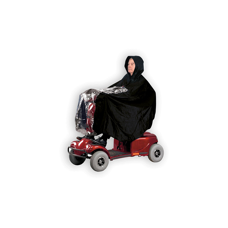 Diseño tipo poncho de impermeable para scooter y silla de ruedas eléctrica con capucha ajustable y visera.