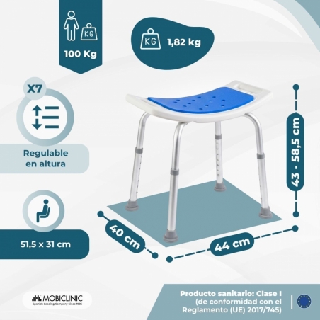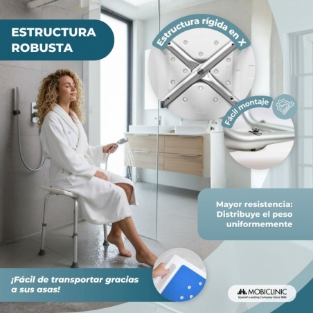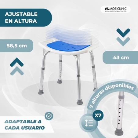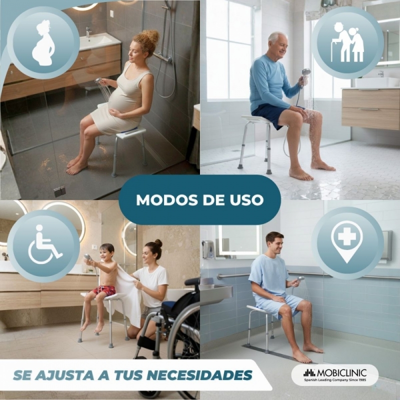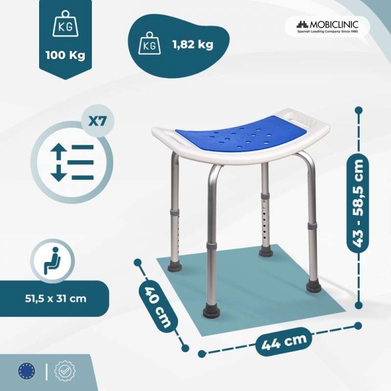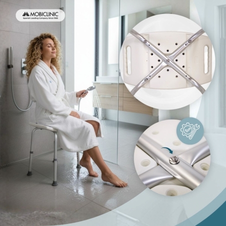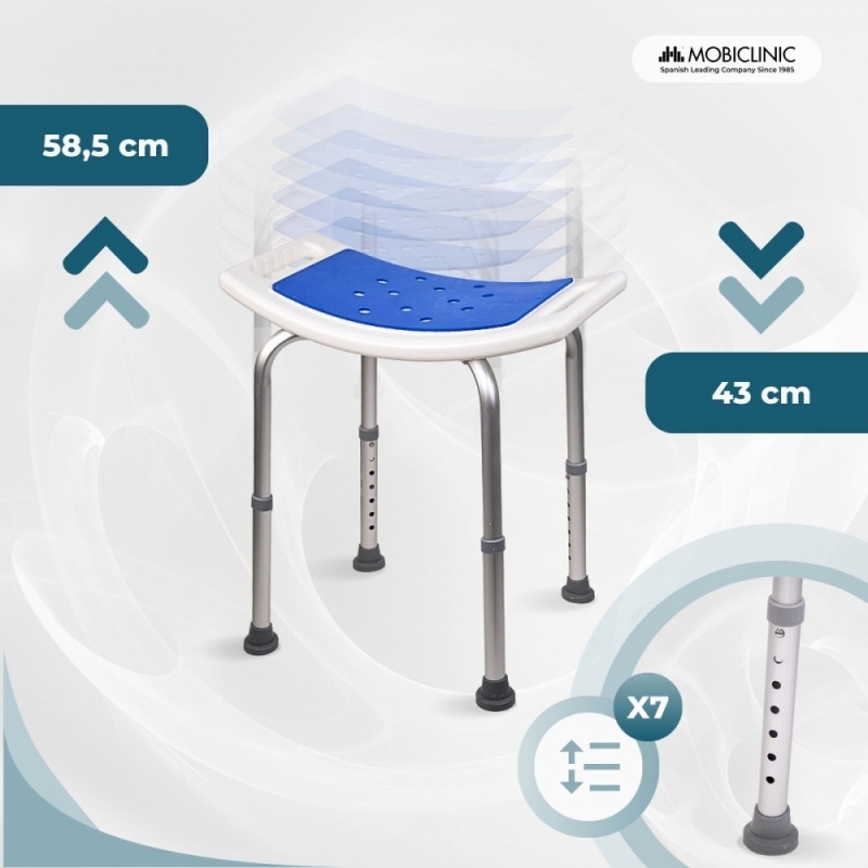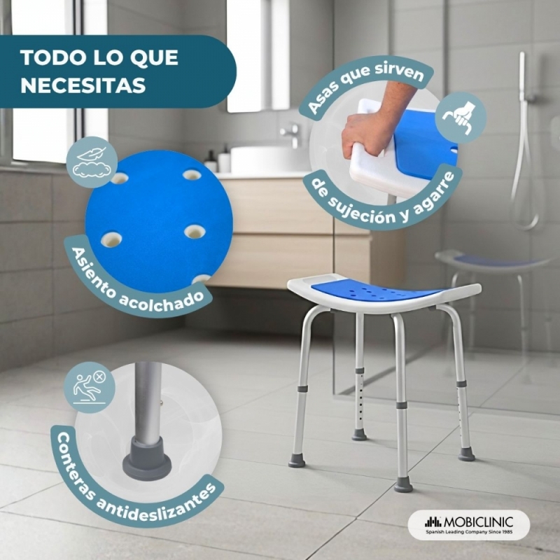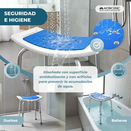 Su altura es regulable lo que permite adaptarla a las diferentes necesidades del usuario o a la altura de las duchas o bañeras. Gracias a su sistema de ajuste de botón mediante clip, el cambio de altura se efectúa de manera rápida y sencilla. Su asiento curvado está diseñado para ofrecer comodidad y se ajusta al cuerpo del usuario. Incorpora una almohadilla de EVA PAD antideslizante que evita posibles deslizamientos. Es suave, resistente al agua y fácil de limpiar, contribuyendo a mantener la higiene diaria sin esfuerzos.