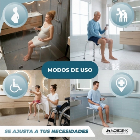 AJUSTABLE Y SEGURO: Este taburete de baño dispone de altura ajustable que permite adaptarse a los diferentes usuarios, tipos de ducha o bañeras. Su sistema de clip por botón lo hacen muy fácil de ajustar, sin necesidad de herramientas, garantizando una postura cómoda y segura. Perfecto para personas mayores, en rehabilitación o con movilidad reducida, acompañándolas en su aseo diario.