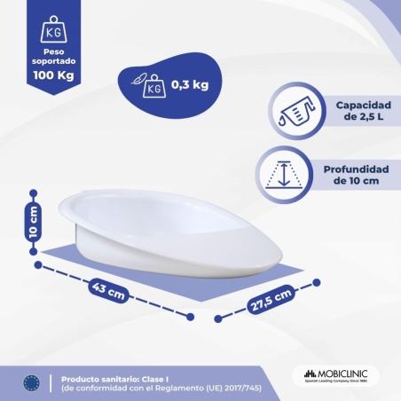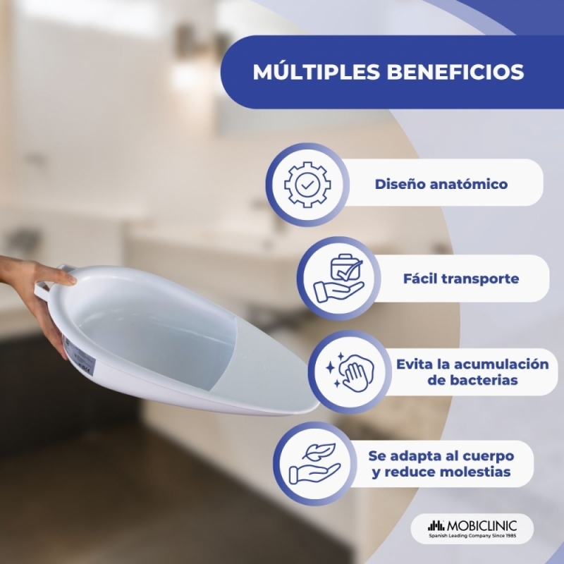 HIGIÉNICA Y REUTILIZABLE: Su material liso e impermeable de polipropileno, puede desinfectarse y limpiar tras cada uso con agua tibia y jabón neutro. Su estructura de una sola pieza evita la acumulación de bacterias, manteniendo la higiene y seguridad del paciente