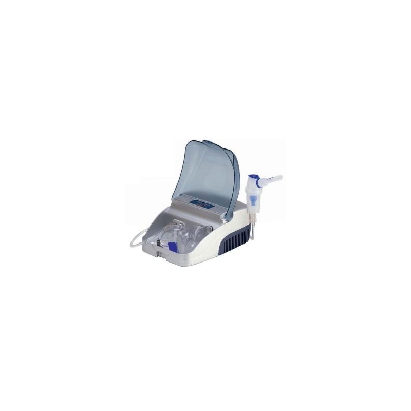 Nebulizador con válvula y sistema antiderrame, en tubo caracterizado TÜV. Válvula de aspiración con dos modos de operación. Compresor de pistón. Caudal de aire al compresor: 10 L/min. Capacidad máxima de medicamento: 8 ml.