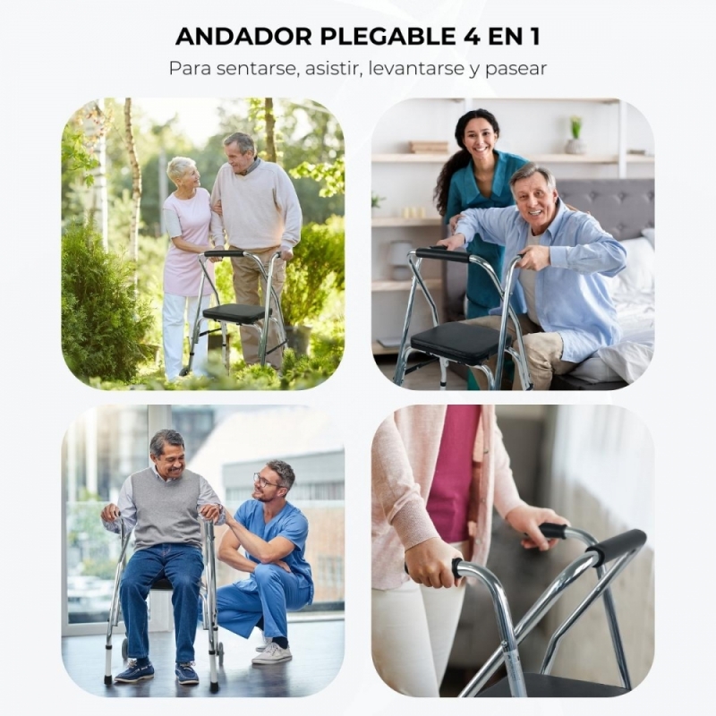 PLEGABLE: es un andador plegable que podrás guardar donde quieras, ya sea para llevarlo de viaje o para guardarlo en casa sin que ocupe demasiado espacio.