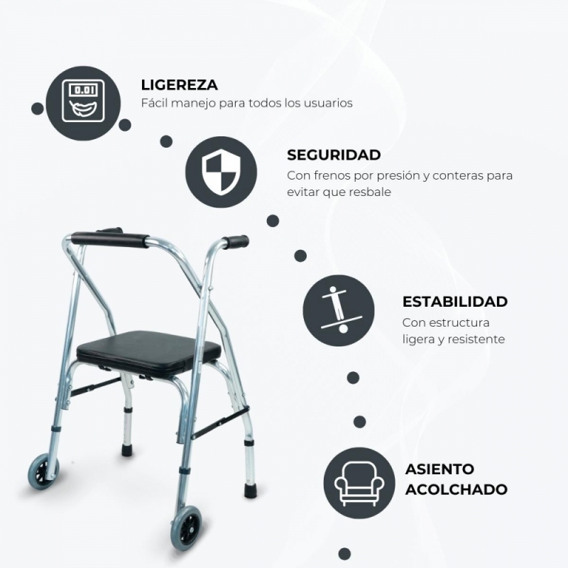 - Su multifuncionalidad: ya que además de como andador, también cuenta con un asiento acolchado sobre el que poder descansar.