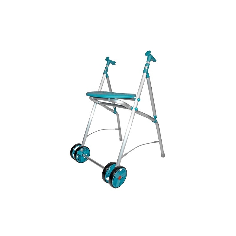 El modelo de andador ortopédico de Forta está fabricado en aluminio, posee dos ruedas delanteras dobles, un asiento confortable que permite el descanso a los adultos y está preparado para poder colocarle tanto ruedas traseras como una cesta de tela.