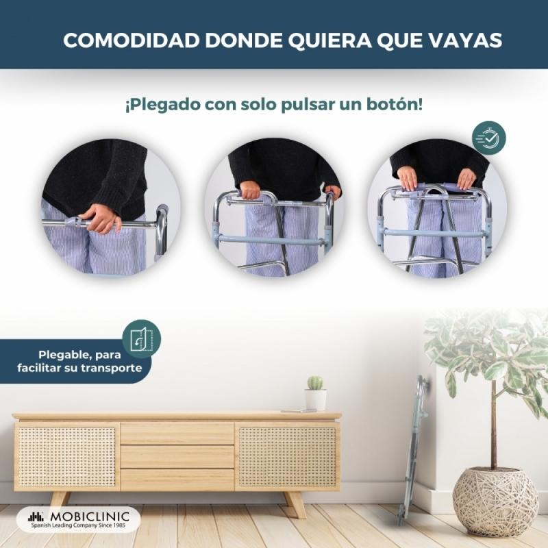 PLEGABLE: tiene incorporado un botón en el chasis que permite plegar el andador para ancianos de forma rápida y cómoda, ocupando muy poco espacio y siendo muy fácil de guardar.