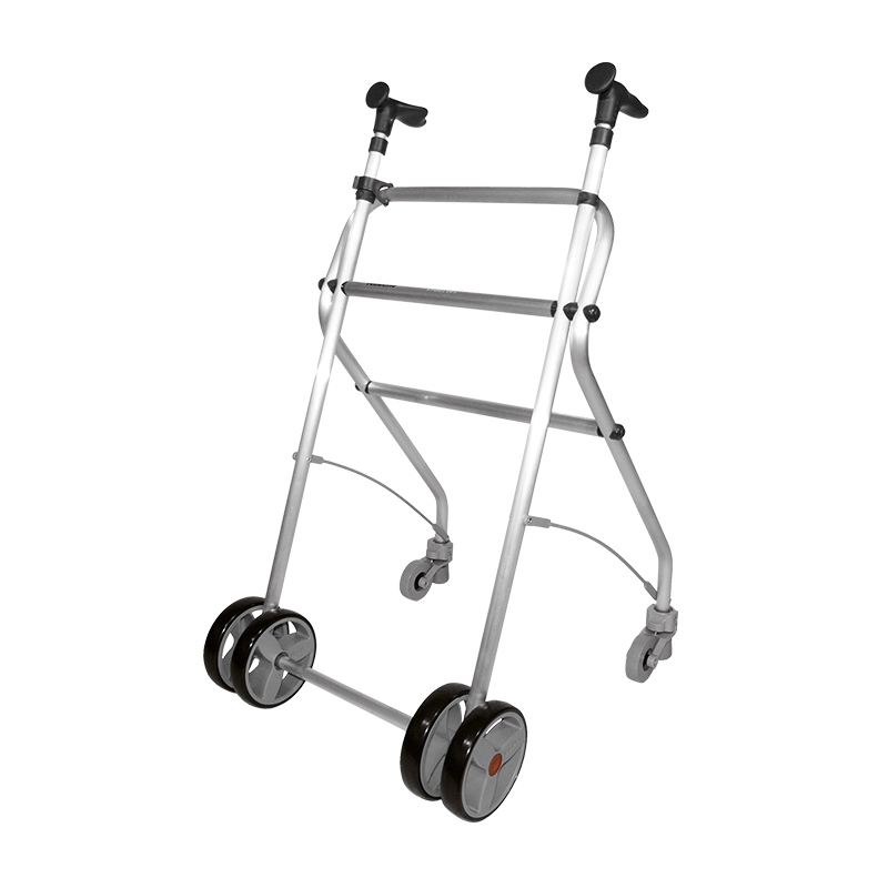 El andador para ancianos es muy resistente gracias a su estructura de aluminio, sus empuñaduras ergonómicas regulables en altura y sus ruedas dobles fijas delanteras.