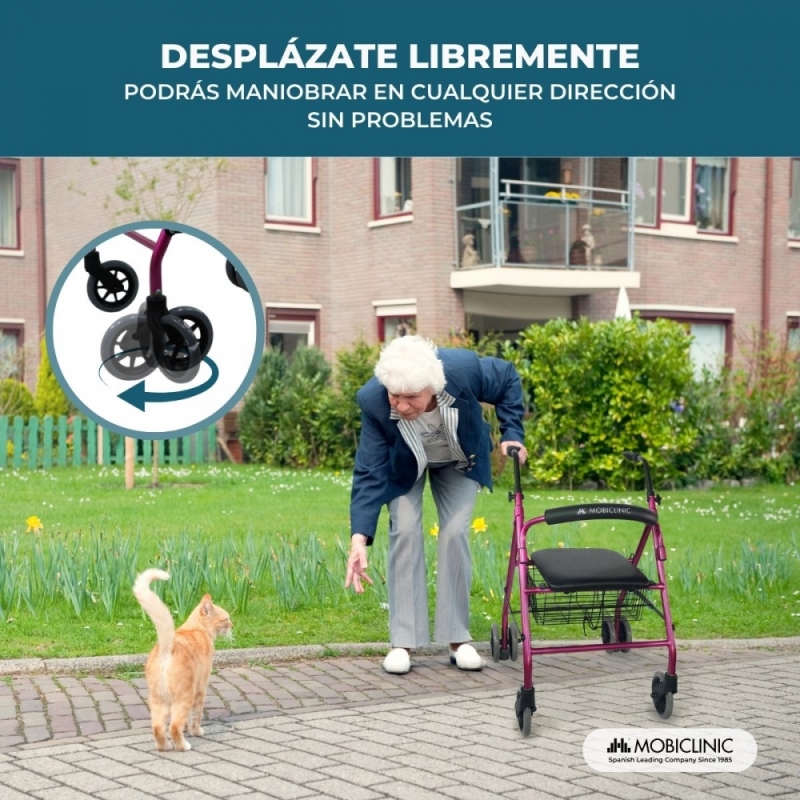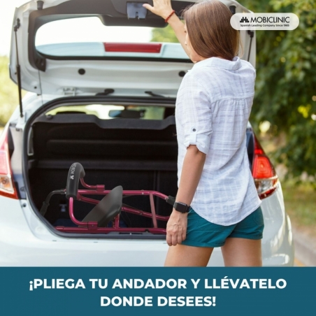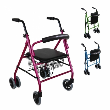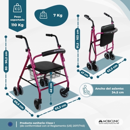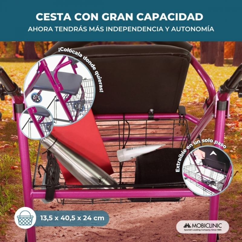 Andador plegable | Asiento y respaldo | Aluminio | Cesta | Para ancianos | Rosa | Prado | Mobiclinic