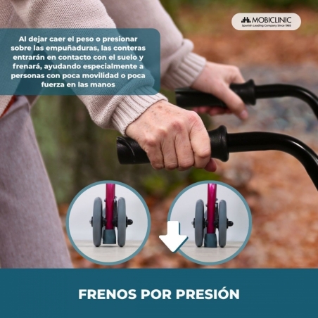 SEGURO: este andador para adultos dispone de frenos por presión, que se accionan fácilmente al ejercer fuerza sobre las empuñaduras del andador con ruedas. Este modelo ayuda a prevenir las caídas dándole al usuario una gran seguridad para que pueda desplazarse con tranquilidad y ganando autonomía e independencia.