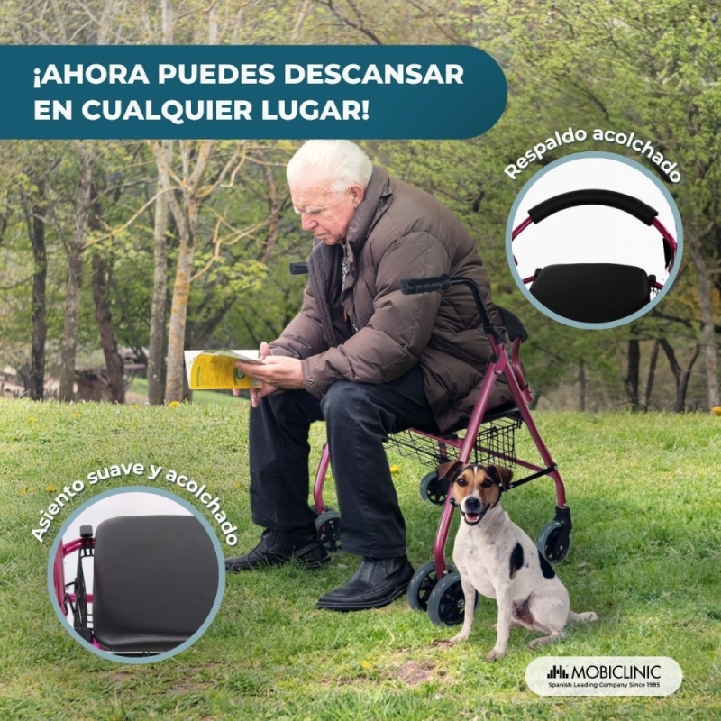 - Cuenta con dos ruedas delanteras giratorias 360º, un asiento confortable que permite el descanso del usuario, un respaldo acolchado y frenos que se activan por presión al ejercer fuerza sobre las empuñaduras (dejando caer el peso del cuerpo sobre los puños).