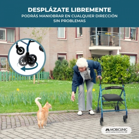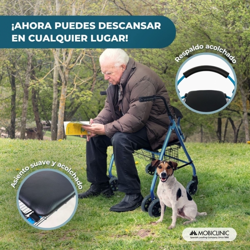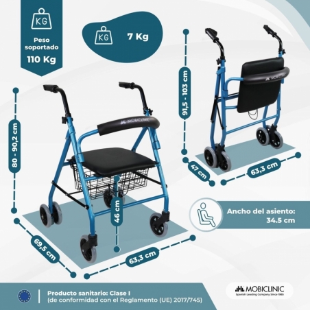 Andador plegable | Asiento y respaldo | Aluminio | Cesta | Para ancianos | Azul | Prado | Mobiclinic