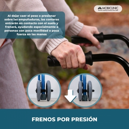 SEGURO: este andador para adultos dispone de frenos por presión, que se accionan fácilmente al ejercer fuerza sobre las empuñaduras del andador con ruedas. Este modelo ayuda a prevenir las caídas dándole al usuario una gran seguridad para que pueda desplazarse con tranquilidad y ganando autonomía e independencia.
