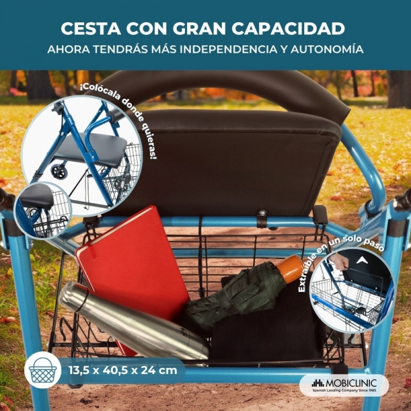 - Posee una cesta para la compra que puede colocarse debajo del asiento o en la parte frontal del andador.