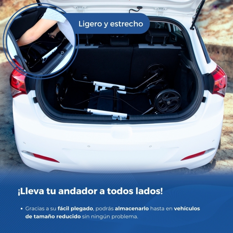 SENCILLO ALMACENAMIENTO Y TRANSPORTE: El almacenamiento de este andador para ancianos es muy sencillo. Gracias a sus medidas de plegado 57x41x85 cm, podrás guardar o trasladar el andador plegable sin problema ya que cabe en el maletero de un coche estándar, o poner detrás de una puerta o en un armario.