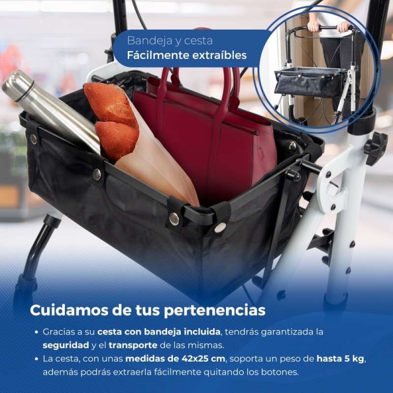 Este andador viene también con una bandeja portaobjetos, donde podrá transportas objetos ligeros que necesite tener a mano o trasladar, como una taza de te, un costurero, un libro, entre otros. Este bandeja trae unos salientes que encajan en las muescas de la base de apoyo para evitar que se deslice y, como la cesta, también puede quitarla cuando no necesite usarla.