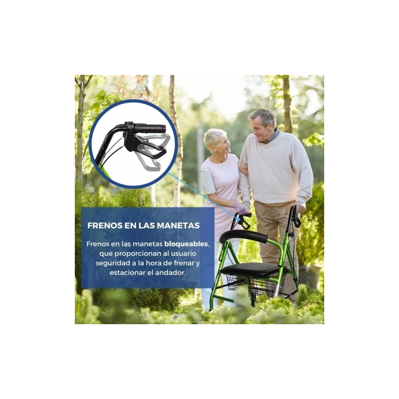 MAYOR SEGURIDAD sus frenos de mano y puños ergonómicos se adaptan ayudando a repartir y amortiguar el peso al caminar, permitiendo un mejor manejo del andador. Si se necesita inmovilizar por completo el andador, hay que tirar de las manetas de los frenos hacia abajo y las ruedas quedarán bloqueadas. Para desbloquear hay que tirar de las manetas hacia arriba.