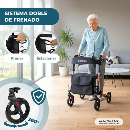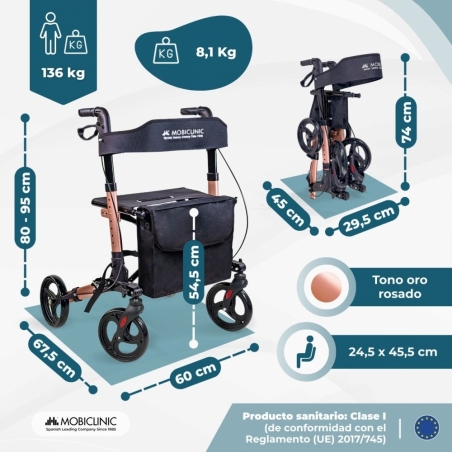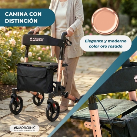 Andador plegable | Aluminio | Hasta 136 Kg | Frenos en manetas | Asiento y respaldo | Oro Rosa | Trajano | Deluxe | Mobiclinic