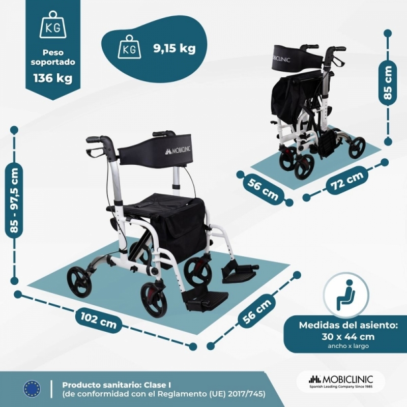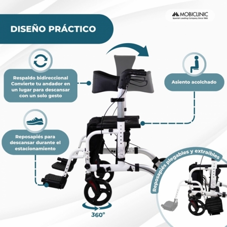 Dispone de un asiento acolchado y respaldo reversible, que se puede colocar hacia delante o hacia atrás, proporcionando un apoyo cómodo durante las pausas. Sus reposapiés abatibles en 5 niveles permiten descansar las piernas de manera segura y práctica, siempre como complemento al descanso y sin sustituir el uso de una silla de ruedas.