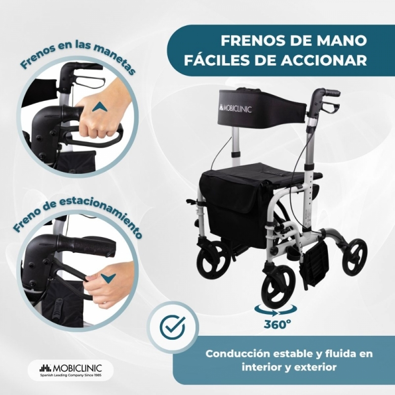La seguridad está garantizada gracias a su estructura de aluminio ligero y resistente, con capacidad para soportar hasta 136 kg. Además, los frenos de mano integrados en las empuñaduras son fáciles de accionar, incluso para personas con poca fuerza en las manos, aportando confianza en cada uso.