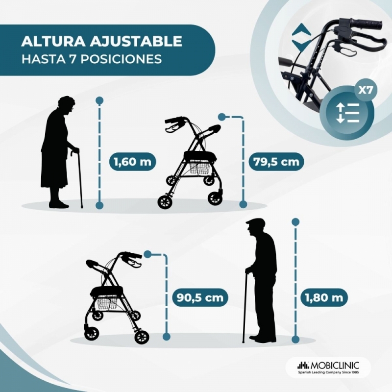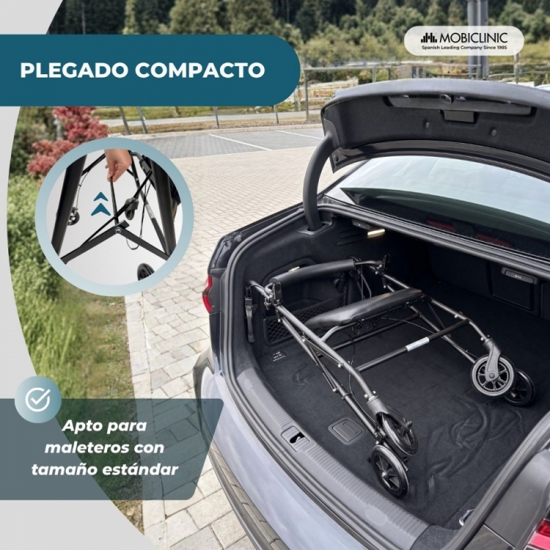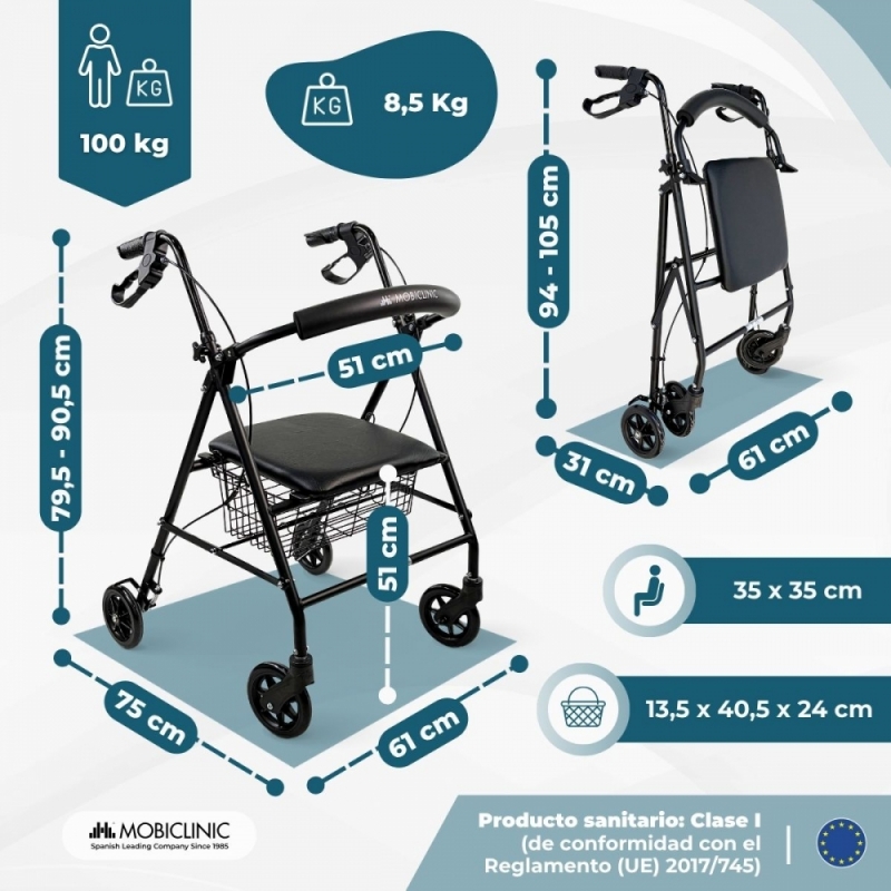 Sus cuatro ruedas macizas están diseñadas para facilitar el desplazamiento en diferentes superficies, superando pequeños obstáculos con facilidad y eliminando el riesgo de pinchazos. Su sistema de plegado permite reducir considerablemente su tamaño, facilitando su almacenamiento en cualquier espacio del hogar o su transporte en coche. Además, su ancho total de 61 cm permite atravesar puertas estándar sin dificultad, mejorando la movilidad en el hogar.