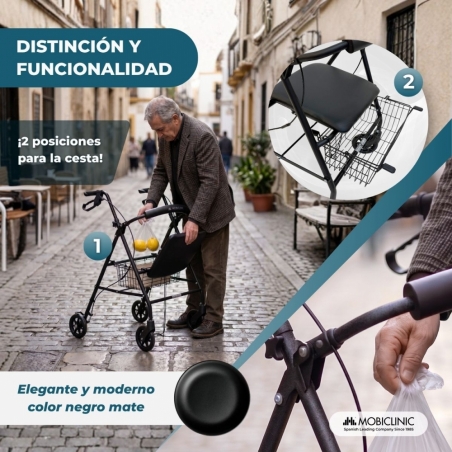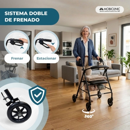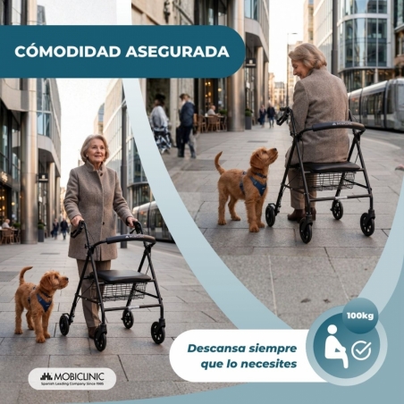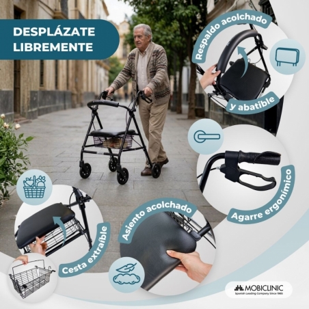 Pensado para ofrecer el máximo confort, este andador incluye un asiento y respaldo acolchados que permiten descansar en cualquier momento de forma cómoda y segura. Esta característica es especialmente útil durante paseos largos o en momentos en los que se necesita una pausa. Además, dispone de una práctica cesta portaobjetos facilitando el transporte de compras o pertenencias personales.
