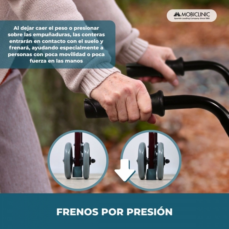 SEGURO: este andador para adultos dispone de frenos por presión, que se accionan fácilmente al ejercer fuerza sobre las empuñaduras del andador con ruedas. Este modelo ayuda a prevenir las caídas dándole al usuario una gran seguridad para que pueda desplazarse con tranquilidad y ganando autonomía e independencia.