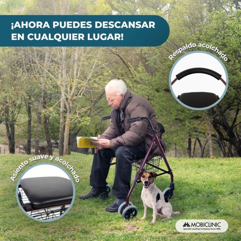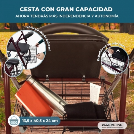 Andador plegable | Asiento y respaldo | Aluminio | Cesta | Para ancianos | Burdeos | Prado | Mobiclinic