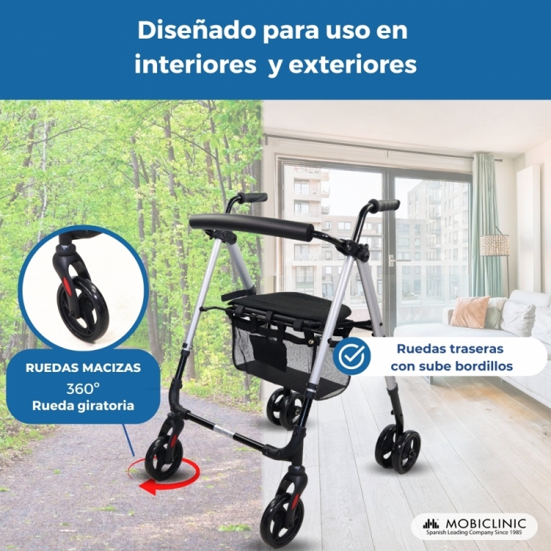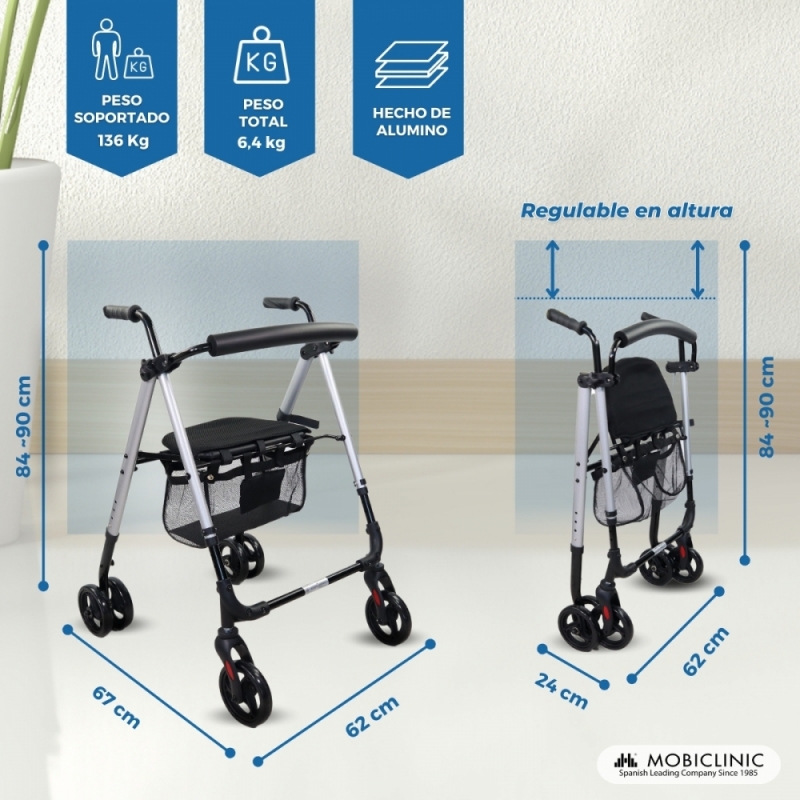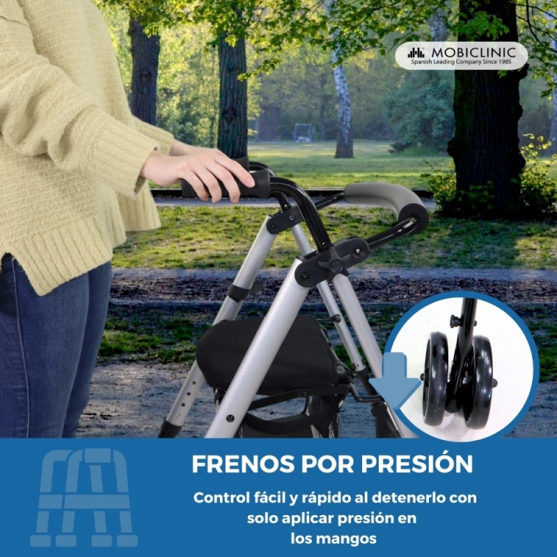 Andador plegable | Aluminio | Asiento y respaldo | Frenos por presión | 4 ruedas | Premium | Dehesa | Mobiclinic