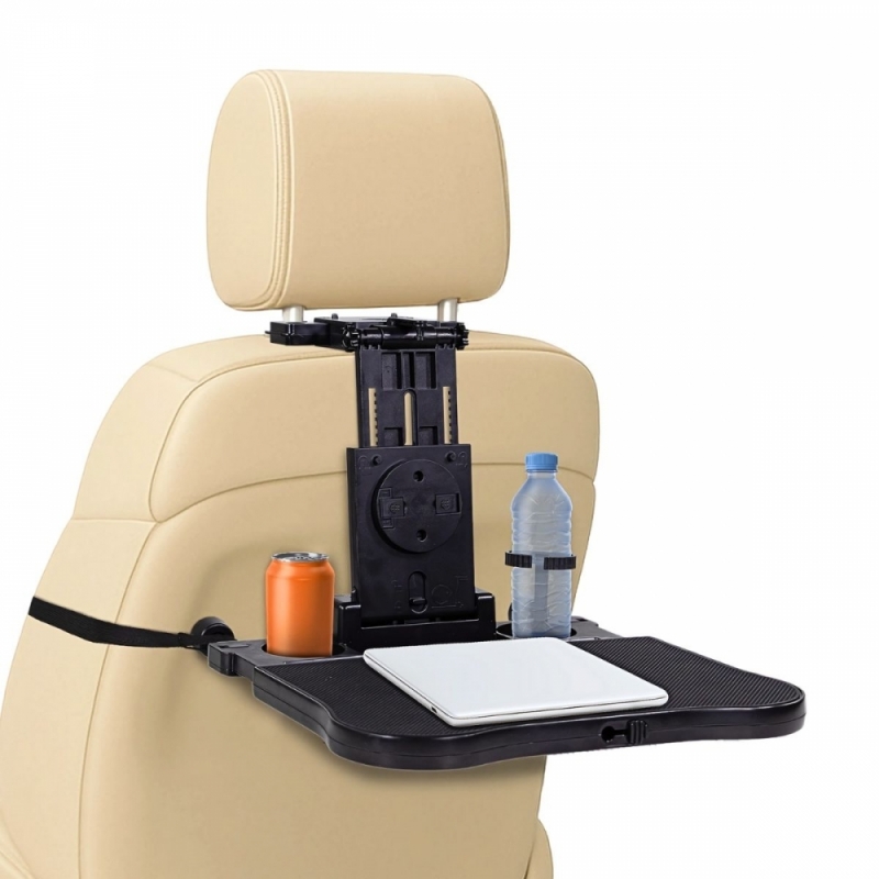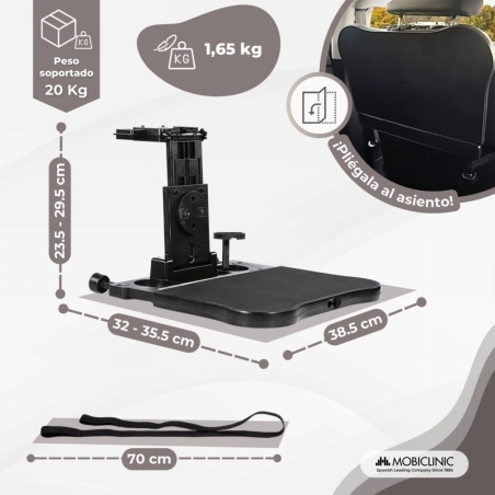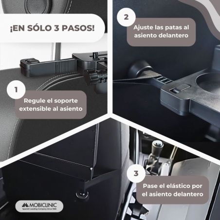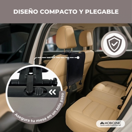 Esta mesa auxiliar no solo ofrece un diseño funcional, sino también varios complementos que mejoran la experiencia del usuario. Un gancho 360º para el móvil que permite colocar el dispositivo en diferentes posiciones. También incluyen una ranura especialmente diseñada para tablets, proporcionando una fijación segura que mantiene el dispositivo seguro durante todo el trayecto.