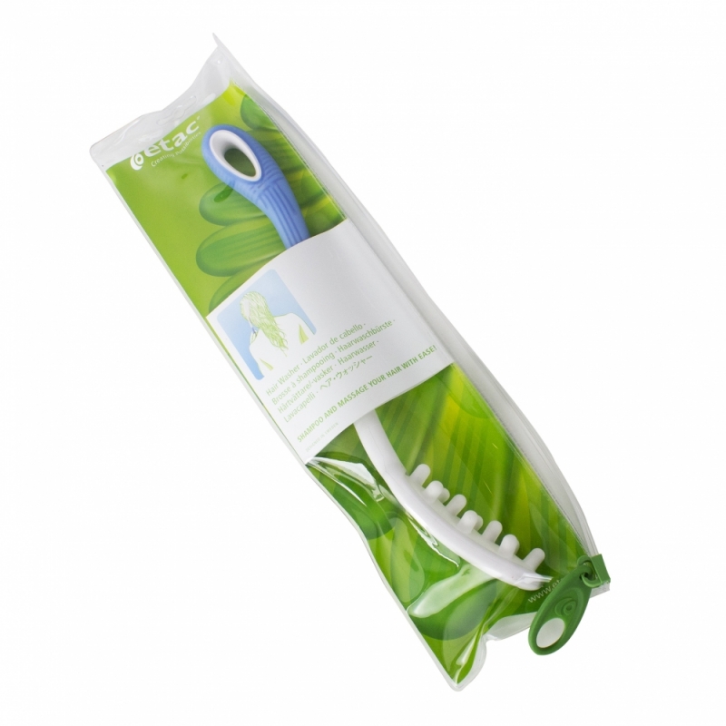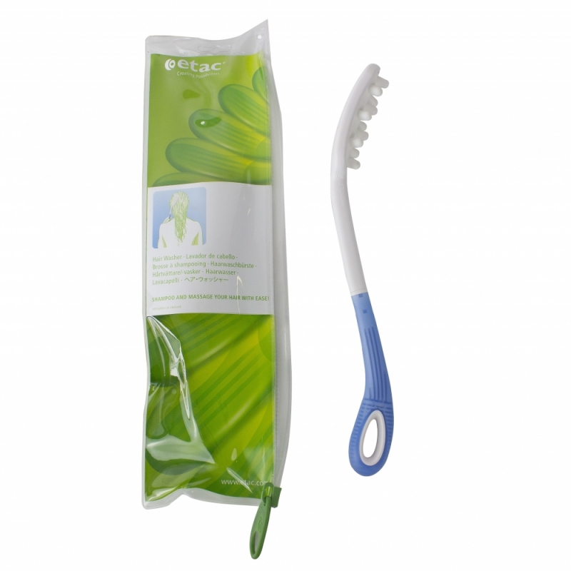Cepillo con mango diseñado para facilitar el lavado del cabello. Sustituye los dedos al aplicar el champú y su diseño permite alcanzar toda la cabeza y realizar el masaje correspondiente.
