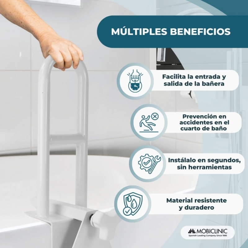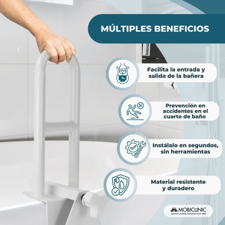 Se ajusta a bañeras con bordes lisos y planos, con un ancho mínimo de 4,5 cm y un máximo de 13,5 cm, adaptándose así a diferentes modelos de bañera. Además, su manija ergonómica permite un agarre firme y seguro, incluso con manos húmedas. Destaca principalmente por su diseño robusto, capaz de soportar hasta 100 kg y es perfecto tanto para uso clínico como doméstico.