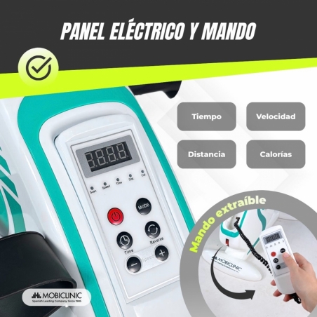 El pedalier incorpora un panel extraíble electrónico multifunción que muestra velocidad, tiempo, distancia recorrida y calorías quemadas. Incluye función Scan, que alterna automáticamente los parámetros para una visualización completa del entrenamiento. Además, la pantalla es extraíble y se convierte en un práctico mando a distancia, facilitando el control del dispositivo sin necesidad de agacharse.