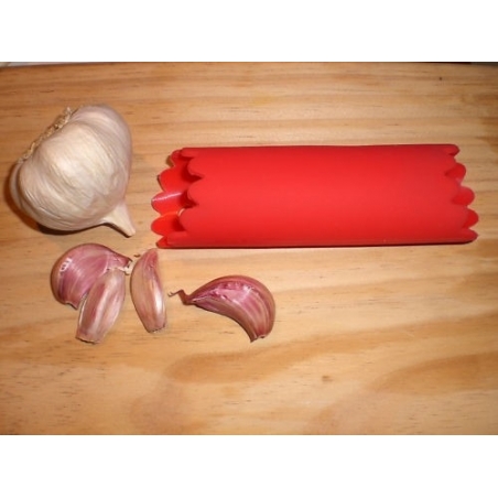 Pelador de ajos fabricado en silicona. Su forma se adapta a la mano del usuario y al alimento, facilitando la retirada de la cobertura del ajo.