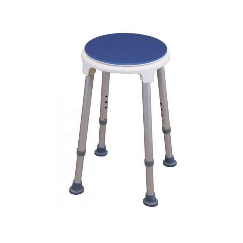 Taburete Blue Seat redondo. Fabricado en aluminio y plástico, con un asiento giratorio para facilitar transferencias. Resulta totalmente inoxidable y muy ligero. Tiene 4 patas regulables con conteras antideslizantes. El asiento incorpora un acolchado blando, de tacto suave para dar un buen confort.