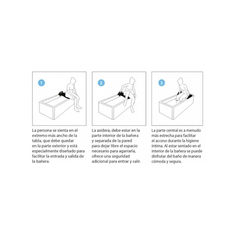 El extremo más ancho facilita la entrada a la bañera y la parte más estrecha proporciona mejor acceso para la higiene íntima.