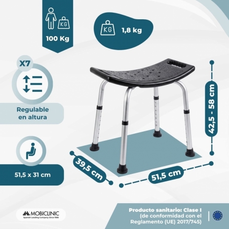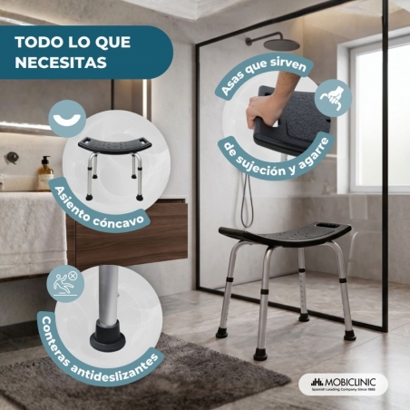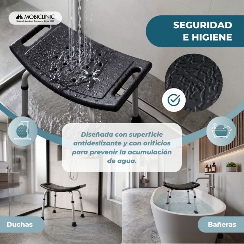 La seguridad está garantizada gracias a sus conteras antideslizantes que mejoran el agarre en superficies mojadas, que reducen el riesgo de posibles accidente durante el baño. Su estructura es robusta y ergonómica, diseñada para ofrecer un soporte firme en el uso. Su amplio asiento en forma de U ofrece comodidad, permitiendo al usuario mantenerse sentado de manera estable y cómoda.
