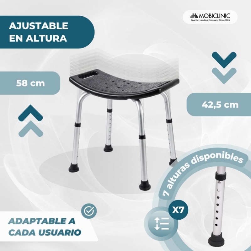 ALTURA REGULABLE Y ADAPTABLE: La banqueta de baño San Fermín cuenta con un sistema de ajuste mediante botón de bloqueo, que regula la altura entre 43 y 58.5 cm de manera sencilla y segura, adaptándose a diferentes usuarios, necesidades y espacios, convirtiéndose en una opción versátil