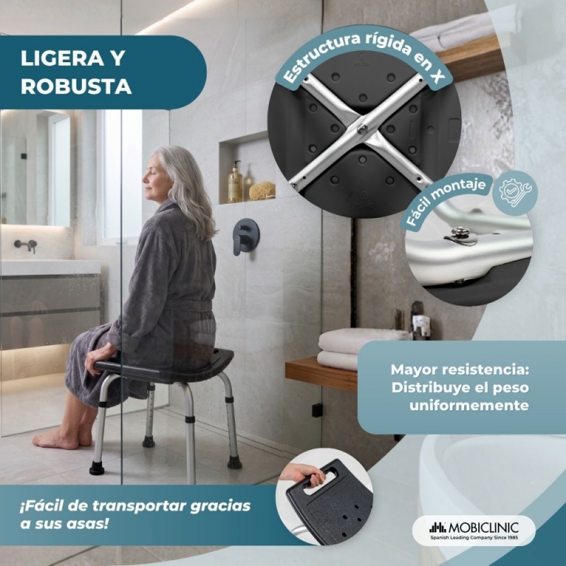 El taburete de baño San Fermín está diseñado para ofrecer seguridad, confort y estabilidad en la higiene diaria, siendo una solución perfecta para personas mayores, con movilidad reducida o en procesos de rehabilitación. Su diseño ergonómico facilita el uso en entornos húmedos como el baño, donde la seguridad es fundamental.