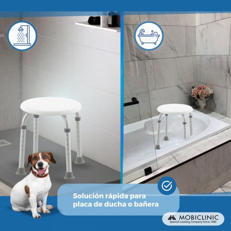 Es regulable en altura en 10 cm de forma independiente cada pata. Las patas tienen conteras con ventosas de alta adherencia para proporcionar mayor estabilidad Su uso está recomendado para personas mayores, ancianos, personas con movilidad reducida o que tienen alguna dificultad para permanecer de pie mucho tiempo.