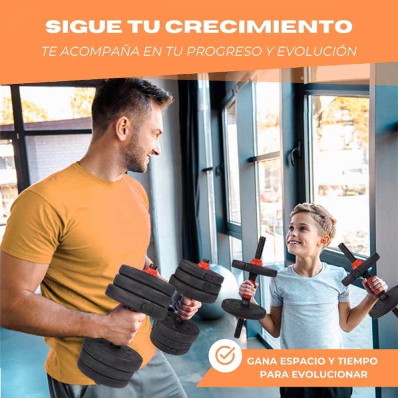 CRECIMIENTO PROGRESIVO: A medida que tu fuerza aumenta, puedes incrementar gradualmente el peso de las mancuernas, lo que te permite seguir desafiando a tus músculos y progresando en tu entrenamiento. Puedes elegir el peso exacto que necesitas para cada ejercicio, para así adaptar tu entrenamiento a tus objetivos y capacidades individuales.