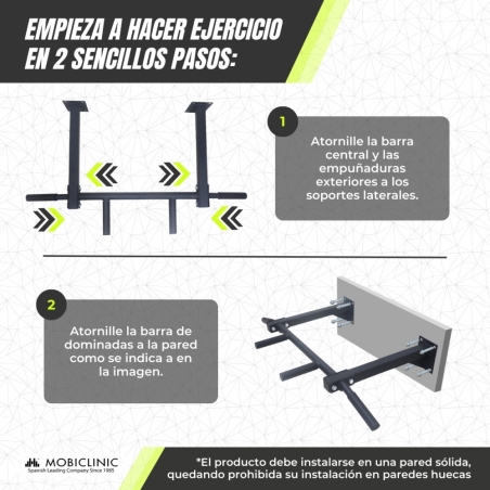 El kit de anclaje incluido permite ajustar la altura de la barra al nivel deseado del usuario, adaptándose así a diferentes necesidades y tipos de ejercicios. Su estructura compacta y resistente asegura que se pueda instalar fácilmente en cualquier pared del hogar.