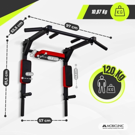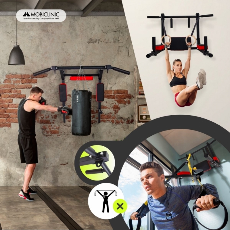 Su estructura de acero reforzado ofrece gran robustez y soporta hasta 120 kg, ideal para usuarios principiantes y avanzados. Además, su sistema de anclaje con 4 ganchos proporciona una fijación firme y segura, evitando posibles desplazamientos. Sus agarres son ergonómicos y están recubiertos con espuma antideslizante que aseguran comodidad y mayor control durante el ejercicio. Incluye también dos agujeros de anclaje lateral que amplían la posibilidad de entrenamiento pudiendo conectar bandas elásticas, poleas o sacos de boxeo.