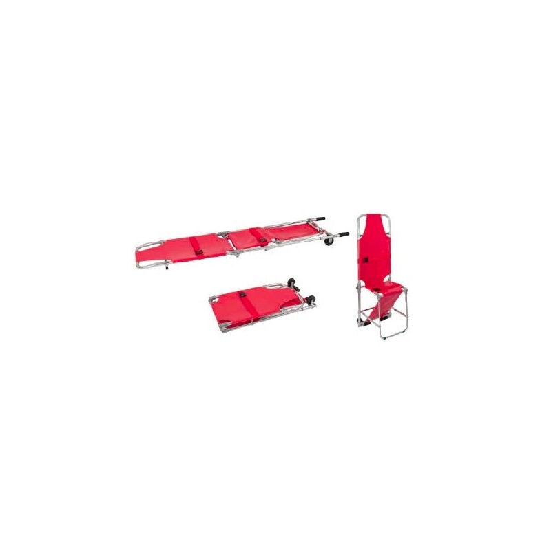 Camilla silla muy ligera de tamaño y peso reducido. Se puede convertir en silla de traslado de pacientes. Posee 2 ruedas funcionales y dos asas de sujeción de aluminio. Dos cinturones garantizan que el proceso de transporte sea seguro.