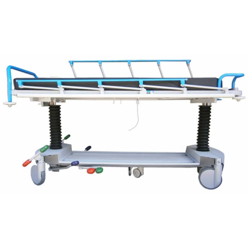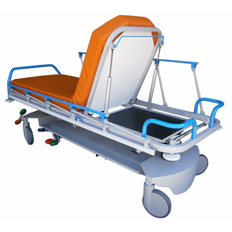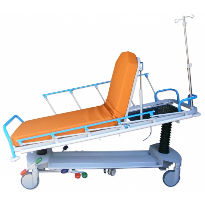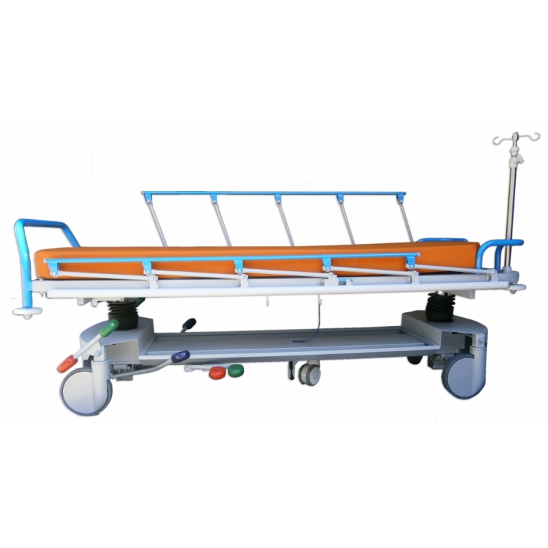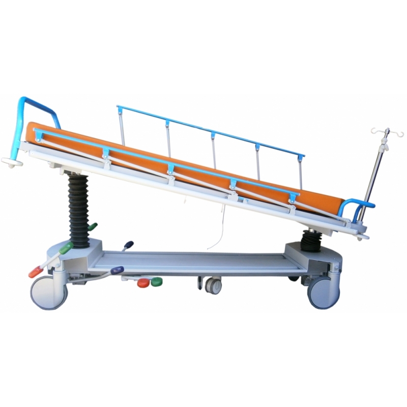 CARACTERISTICAS TECNICAS: Para transporte, acomodo, diagnóstico y/o tratamiento de pacientes, procedimientos y críticos. Estructura de gran robustez, estabilidad y durabilidad en acero pintado al horno en EPOXIPOLIESTER, color estándar gris metalizado aluminio RAL 9006. Lecho 2 cuerpos de material compacto fenólico (HPL) radiotransparente de 6 mm., con colchoneta alta densidad de 10 cm. para larga estancia, tapizada desmontable con velcro. Máximo área en plano y vertical para radiodiagnóstico por Rayos X y Arco en C. Paso inferior para grúas. Respaldo y/o pies (fowler) abatible con movimiento asistido de doble cilindro de gas hidroneumático en palancas manuales. Elevación en altura, con Tren y Antitren mediante 2 columnas hidráulicas (carga combinada estática 1.600 Kg., dinámica 900 Kg.), carenadas mediante fuelles de caucho de fácil limpieza, maniobras accionadas por 3 pedales bilaterales. Barandillas bilaterales plegables con enclave automático de seguridad y protección anti choque. Rodadura con 4 ruedas de 200 mm., carenado plástico, con freno total simultáneo centralizado y rueda servo direccional, accionado a ambos lados de camilla, con sistema de quinta rueda conductiva de 125 mm. con amortiguación. Conexión equipotencial. Asideros de empuje en cabecera ergonómicos, 4 roldanas paragolpes y bandas anti rozaduras laterales. Carriles bilaterales y longitudinales para cinchado de paciente. Base con carenado metálico de fácil limpieza, con portaobjetos y porta botella múltiples de oxígeno. 2 pares de ganchos de drenajes bilaterales. Porta sueros de 2 ganchos, de acero inoxidable telescópico y escamoteable por abatimiento en cabecera. Piecero de empuje y maniobra, extraíble y desmontable. Tapizado técnico vinílico (PVC / Poliester, 650 gr/m2.) con resistencia a la abrasión, transpiración, saliva, sangre, orina, luz UV, aceites y manchas. Resistencia a altas y bajas temperaturas. Protección antimicrobiana, antibacteriana y antimicótico. Ignífugo M2 y lavable. Impermeabilidad. Medidas totales: ancho 81cm x Largo 207 x Alto 78cm Peso producto: 115 kg Peso máximo soportado: 235 kg
