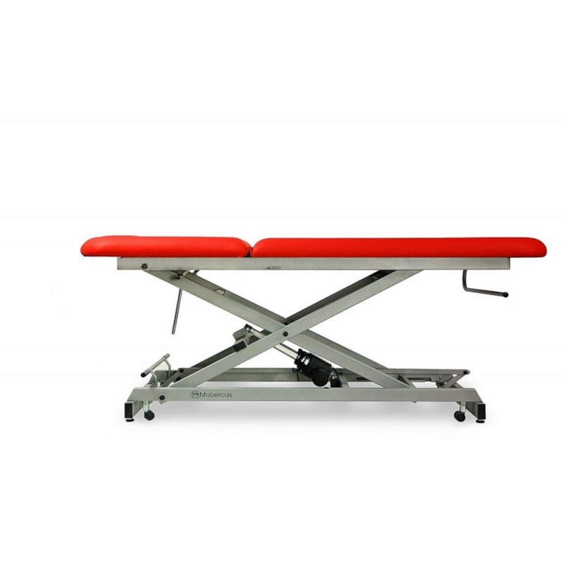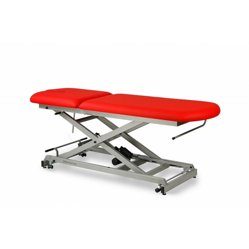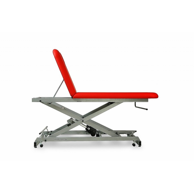 Camilla de reconocimiento eléctrica de 2 secciones con subida recta sin desplazamiento lateral, portarrollos, tapón facial y ruedas escamoteables.