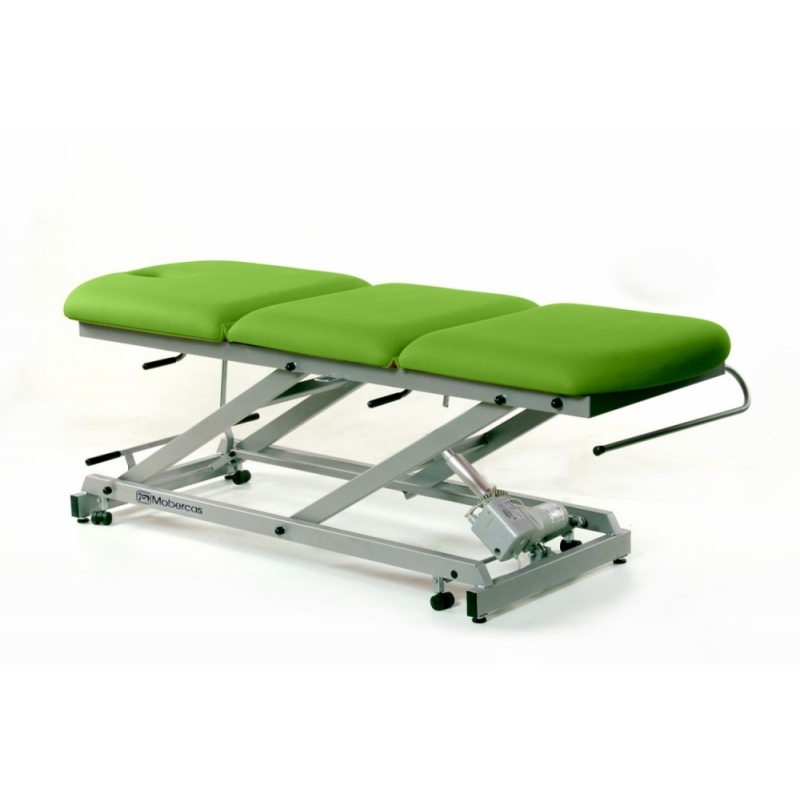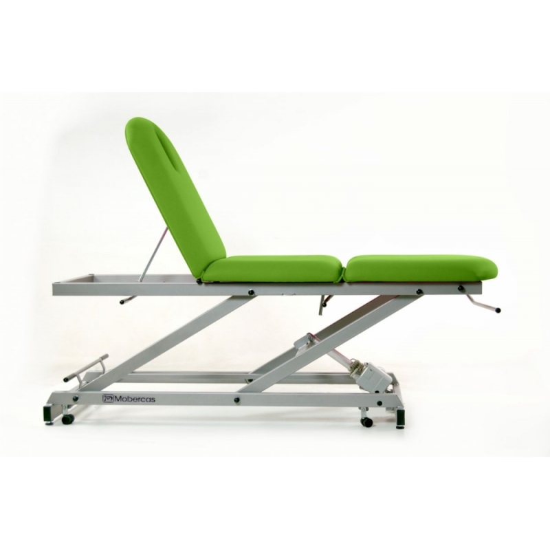 Camilla de reconocimiento eléctrica de 3 secciones con pliegue central manual, portarrollos, tapón facial y ruedas escamoteables.