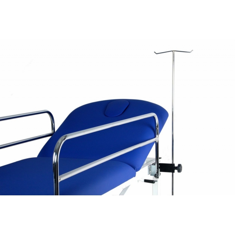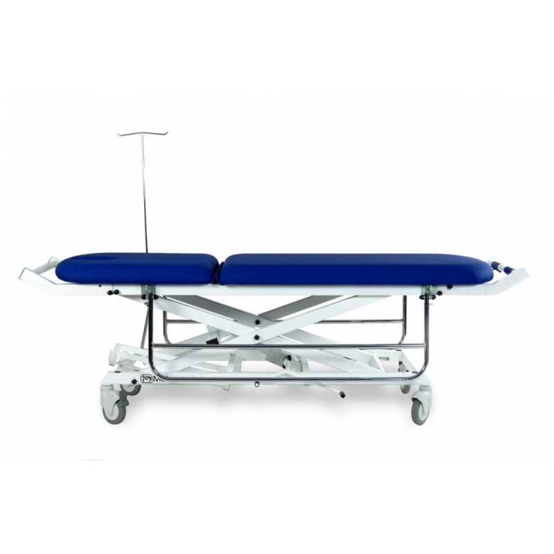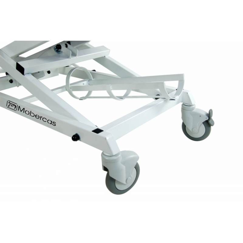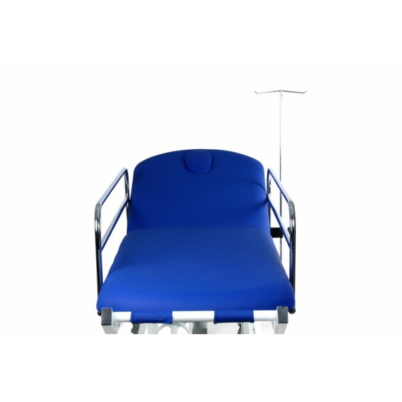 Carro de traslado hidráulico de 2 secciones con barandillas, portasueros, portabombonas, empujadores desmontables y abatibles (en cabezal y piecera) y ruedas de transporte de 125 mm.