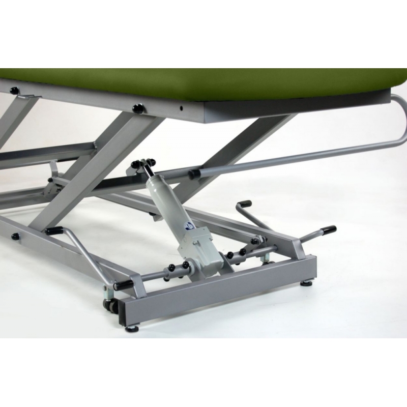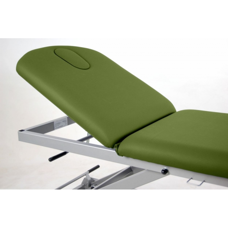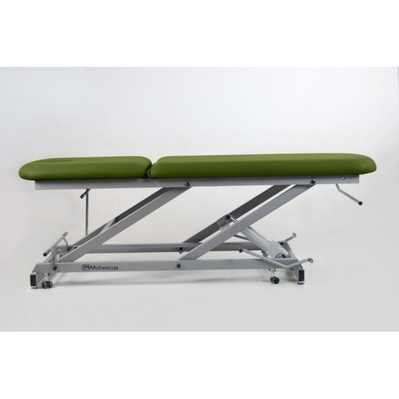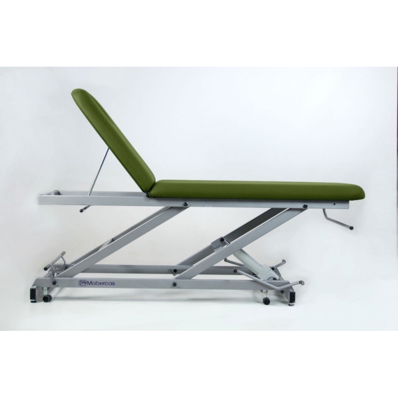 Camilla de reconocimiento hidráulica de 2 secciones, con portarrollos, tapón facial y ruedas escamoteables.