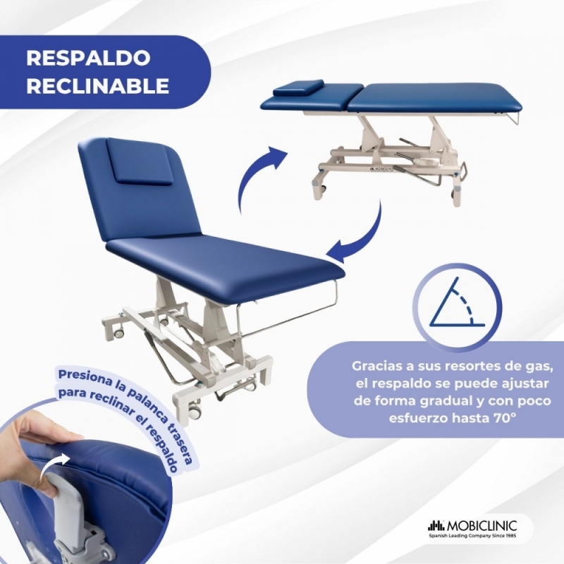 CONFORT Y VERSATILIDAD: Esta camilla cuenta con un respaldo reclinable con resorte de gas, que permite ajustar la inclinación de 0º a 70º de manera precisa, adquiriendo posiciones como tumbada o semisentada. Su espuma de 5 cm de grosor y densidad garantizan máxima comodidad en cada uso